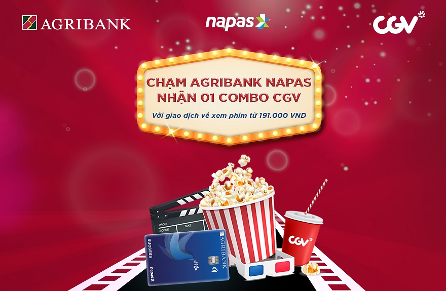 - Tặng 01 (một) CGV Combo cho giao dịch mua vé xem phim từ 191.000 VND khi thanh toán trực tiếp bằng thẻ nội địa Agribank (bao gồm thẻ ghi nợ hoặc thẻ tín dụng)) trên máy POS tại quầy CGV.