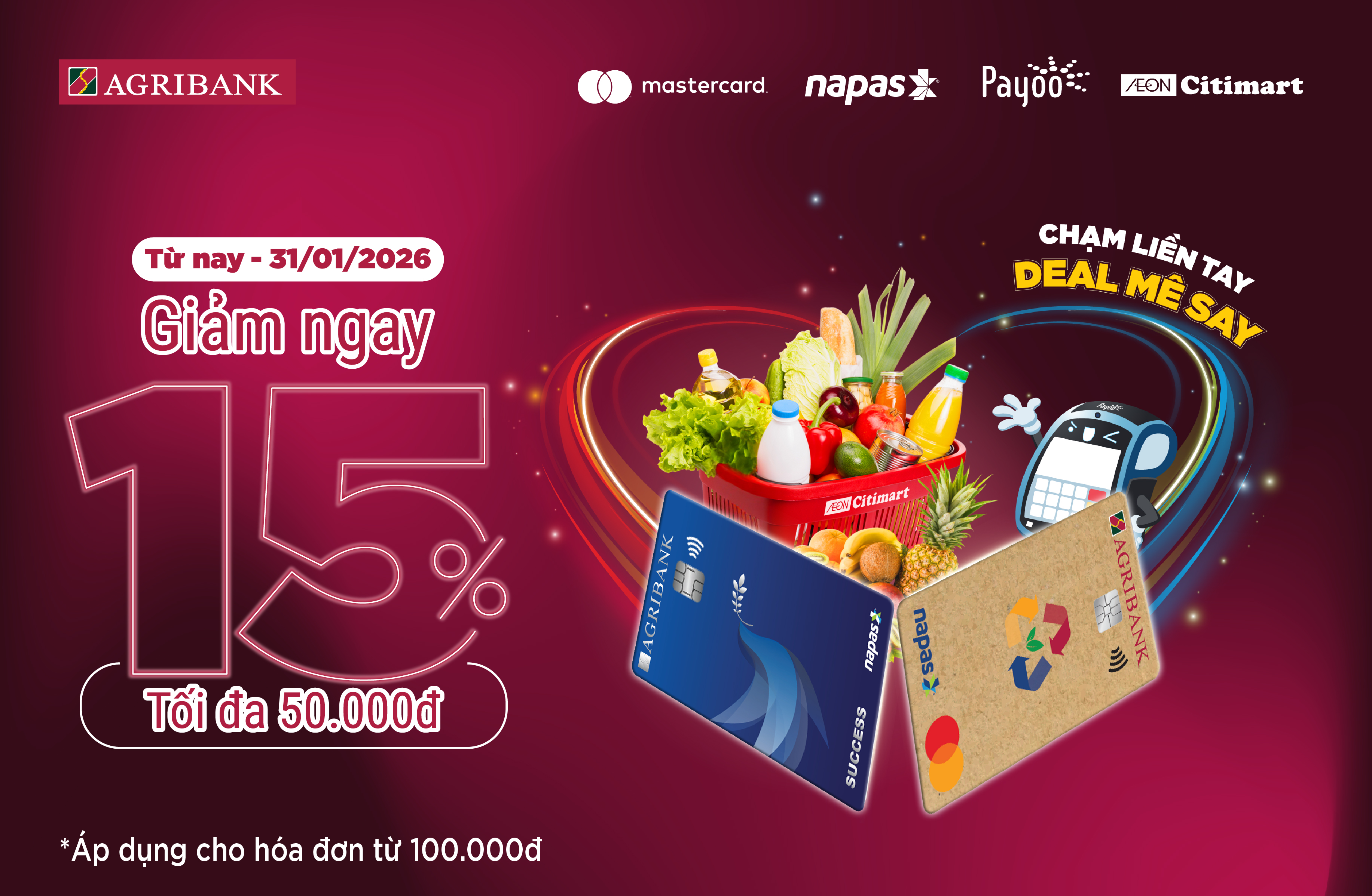 1. Nội dung khuyến mại: Khách hàng sẽ được giảm ngay 15% tối đa 50.000 VND cho hóa đơn từ 100.000 VND khi thanh toán chạm thẻ Agribank trên Payoo POS tại các cửa hàng được áp dụng thuộc hệ thống AEON Citimart.