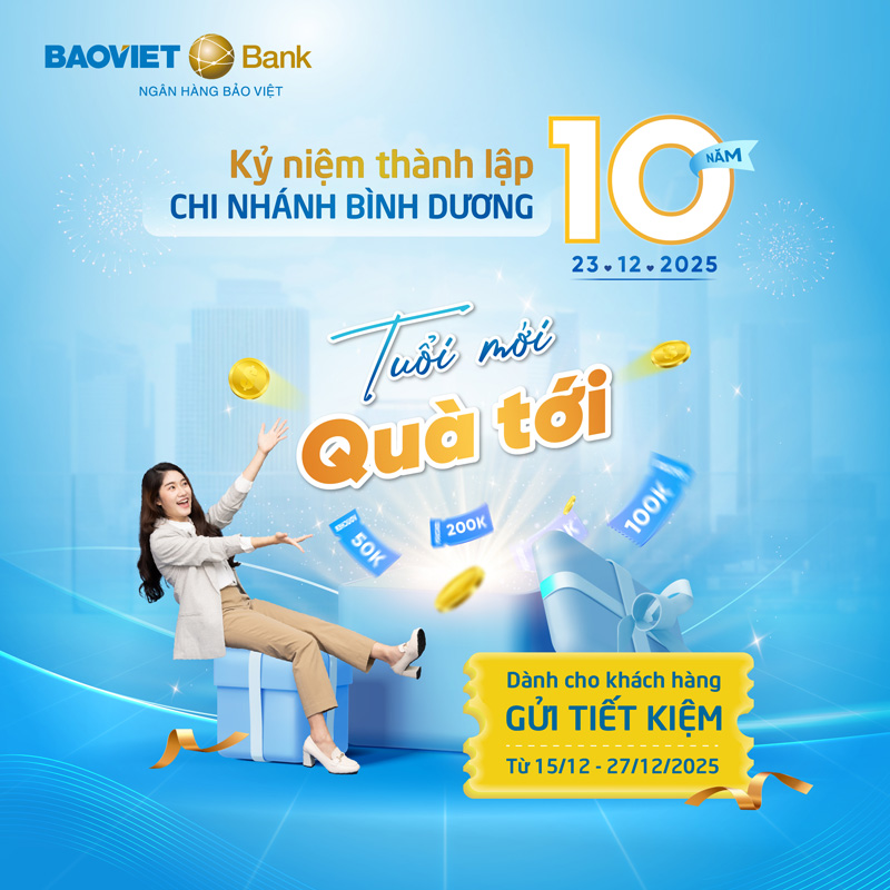 Nhân dịp kỷ niệm 10 năm ngày thành lập Chi nhánh Bình Dương (23/12/2015 – 23/12/2025), BAOVIET Bank dành tặng nhiều phần quà hấp dẫn cho các khách hàng giao dịch từ ngày 15/12 đến hết ngày 27/12/2025.