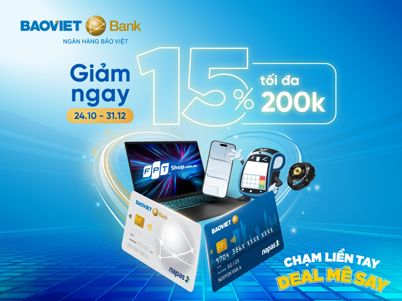 Tận hưởng trải nghiệm mua sắm hiện đại, an toàn và tiết kiệm cùng thẻ BAOVIET Bank tại hệ thống FPT Shop với ưu đãi giảm ngay 15% tối đa 200.000 đồng cho đơn từ 200.000 đồng.