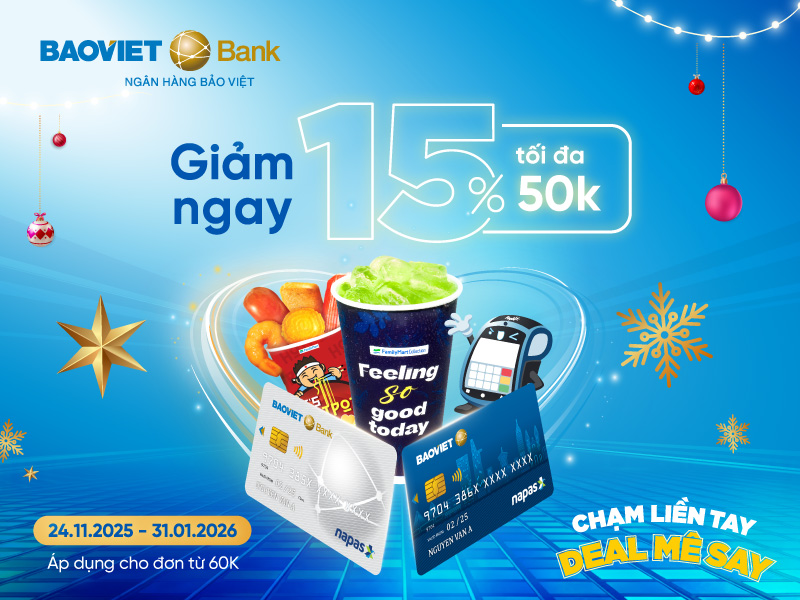 Từ 24/11/2025 đến hết 31/01/2026, BAOVIET Bank phối hợp với Mastercard, NAPAS, Payoo và FamilyMart mang tới khách hàng ưu đãi giảm ngay 15% tối đa 50.000 đồng cho đơn từ 60.000 đồng khi sử dụng thẻ ghi nợ nội địa và tín dụng nội địa BAOVIET Bank thanh toán trên thiết bị Payoo POS tại các cửa hàng của FamilyMart.