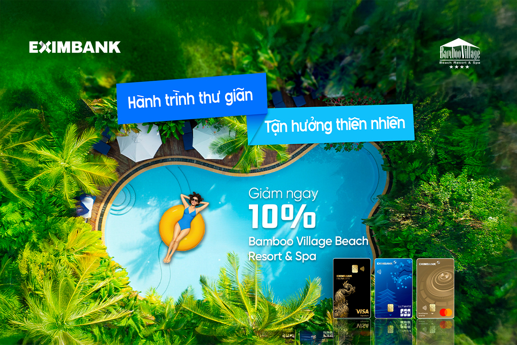 - Ưu đãi 10% cho chủ thẻ Eximbank khi đặt phòng trực tiếp tại Bamboo Village Beach Resort & Spa.