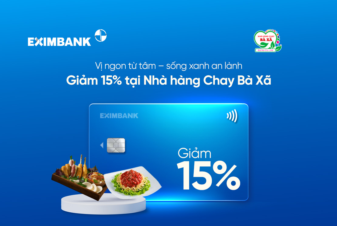 - Giảm giá 15% tại Nhà hàng Chay Bà Xã khi Quý khách thanh toán qua thẻ Eximbank.