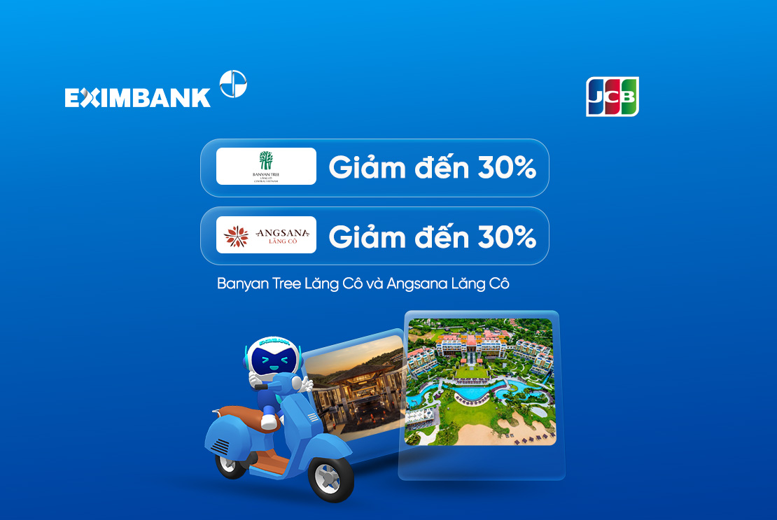 Chủ thẻ Eximbank JCB đặt phòng và dịch vụ trước qua hotline +842343695800 hoặc email reservations-langco@angsana.com đối với khu nghỉ dưỡng Angsana Lăng Cô và hotline +842343695888 hoặc email Reservations-Langco@banyantree.com đối với khu nghỉ dưỡng Banyan Tree Lăng Cô