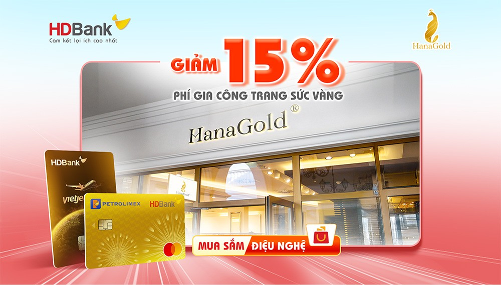 Trong thời gian khuyến mại, Giảm 15% phí gia công trang sức vàng tại hệ thống HanaGold khi khách hàng thanh toán bằng thẻ tín dụng HDBank, cụ thể:
