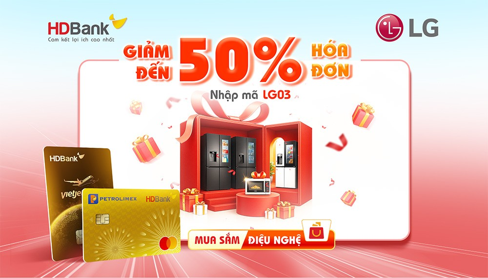 Trong thời gian khuyến mại, Giảm đến 50% tất cả sản phẩm LG khi mua hàng trên website và thanh toán bằng thẻ tín dụng HDBank, cụ thể: