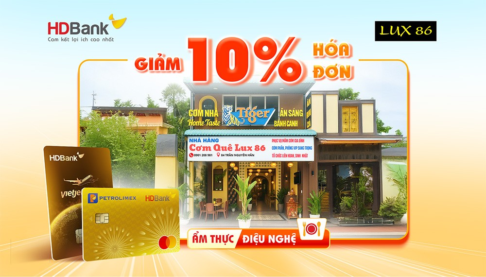 Trong thời gian khuyến mại, Giảm 10% hóa đơn tại nhà hàng Lux 86 Nha Trang khi khách hàng thanh toán bằng thẻ tín dụng HDBank, cụ thể: