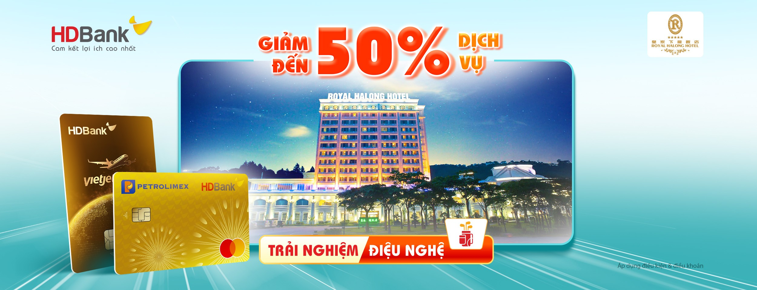 Trong thời gian khuyến mại, Giảm đến 50% hóa đơn dịch vụ tại Royal HaLong Hotel khi thanh toán bằng thẻ tín dụng HDBank, cụ thể: