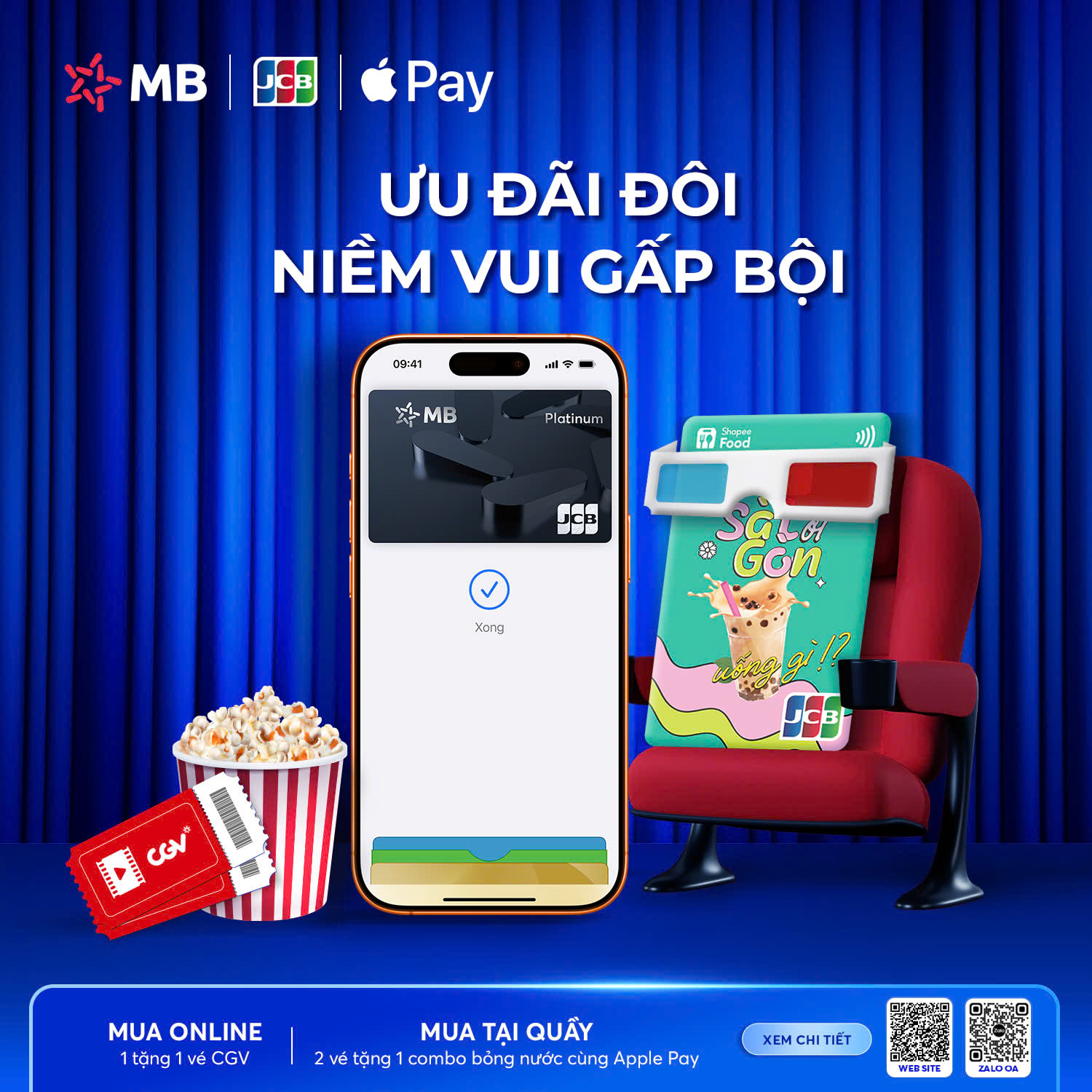 Rủ bạn ra rạp CGV cùng thẻ MB JCB ngay để nhận ưu đãi đến 50%: (1) Mua online: Mua 1 vé tặng 1 vé; (2) Mua tại quầy: Mua 2 vé 2D tặng 1 combo bỏng nước khi thanh toán bằng MB JCB Apple Pay.