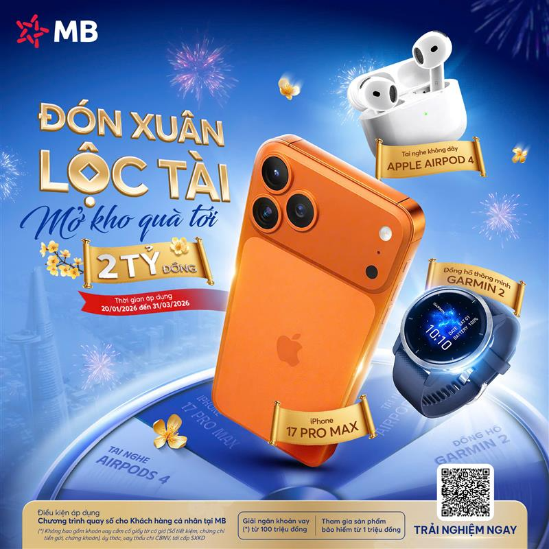 1. Nội dung chi tiết chương trình: Từ ngày 20/01/2026 đến hết ngày 31/03/2026, Khách hàng cá nhân (KHCN) sử dụng sản phẩm tín dụng hoặc bảo hiểm tại MB sẽ có cơ hội tham gia quay số trúng thưởng với cơ cấu giải thưởng hấp dẫn.