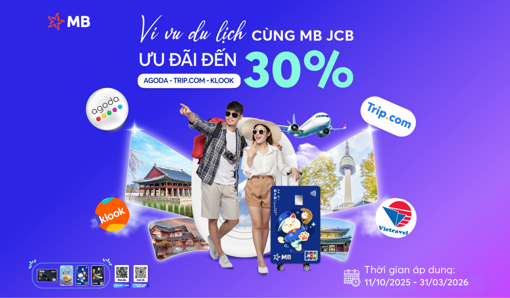 Ưu đãi siêu hời - giảm chi phí du lịch đến 30% khi dùng thẻ MB JCB đặt vé máy bay, khách sạn qua Agoda, Trip.com, Klook, Vietravel.
