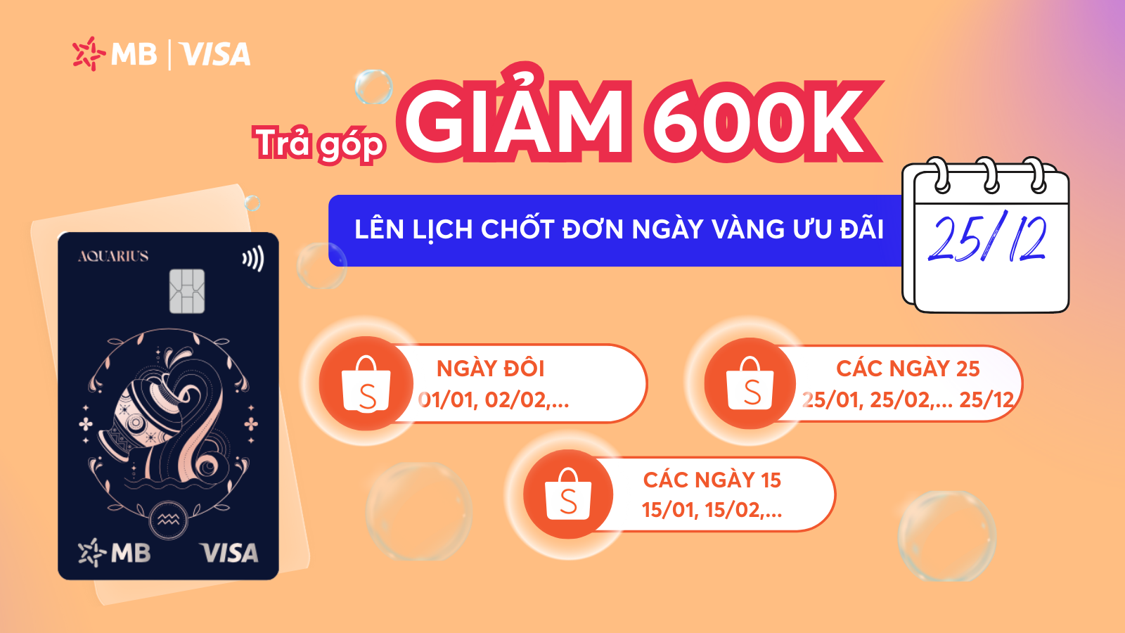 Áp dụng khi mua hàng trả góp tại Shopee Mall bằng thẻ tín dụng MB VISA vào các NGÀY VÀNG ưu đãi cụ thể như sau: