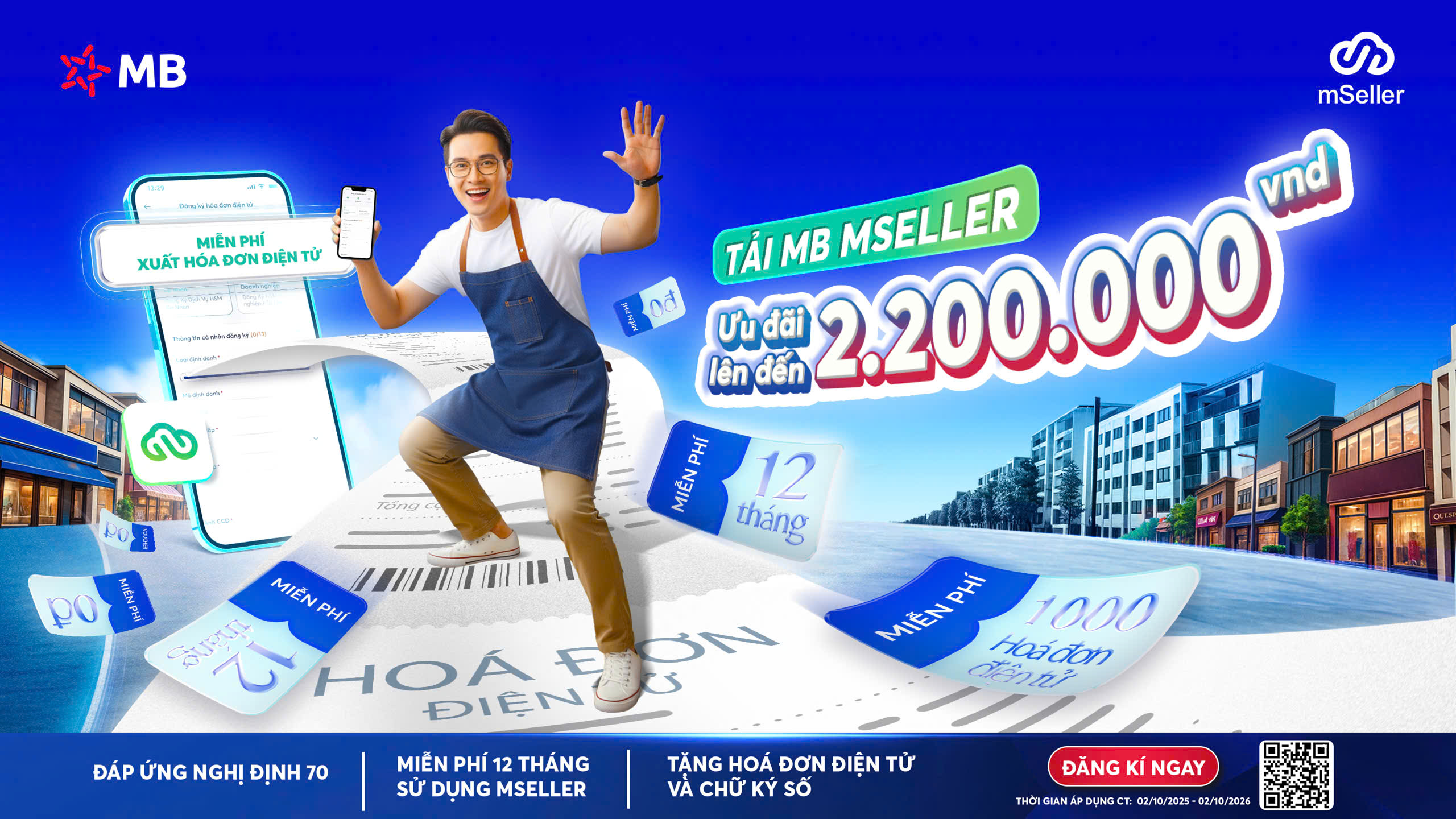 Hưởng ứng Nghị định 70/2025/NĐ-CP về tăng cường quản lý thuế đối với hộ kinh doanh, MB chính thức triển khai chương trình tặng miễn phí ứng dụng mSeller cùng trọn bộ ưu đãi lên đến 2.200.000 đồng.