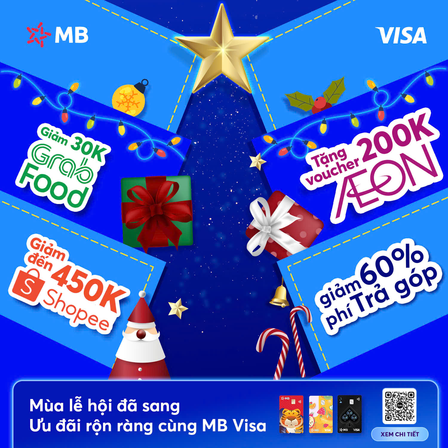 Mùa Giáng Sinh năm nay thẻ MB Visa đem đến vô vàn ưu đãi ẩm thực, mua sắm, du lịch, ... và lựa chọn trả góp với mức giá tốt nhất thị trường. Nhanh tay thanh toán bằng thẻ MB Visa để tận hưởng tối đa ưu đãi mùa lễ hội năm nay nhé!