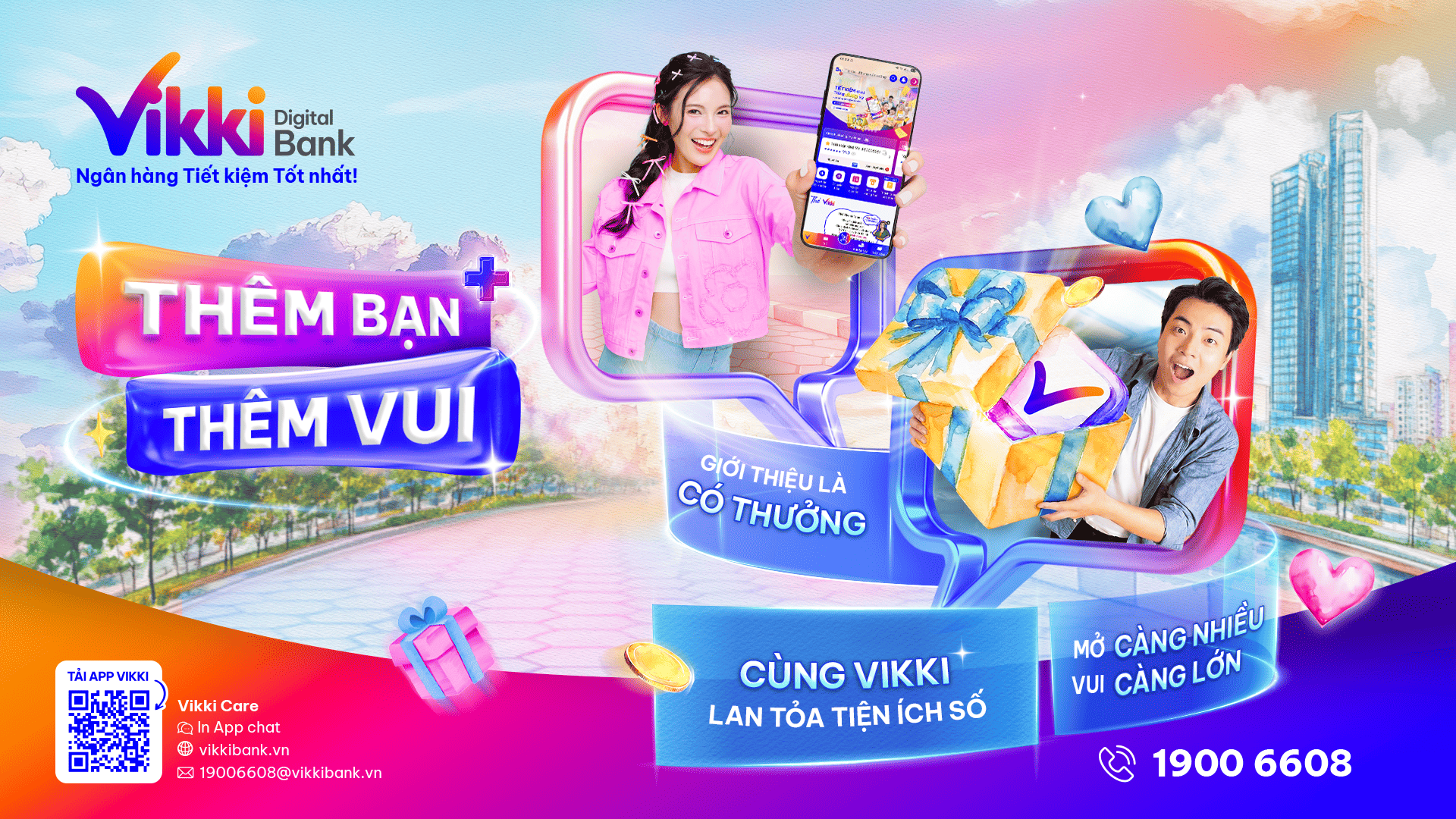 Nhằm gia tăng trải nghiệm khách hàng và lan tỏa lợi ích của ngân hàng số đến cộng đồng, Ngân hàng Số Vikki chính thức triển khai chương trình giới thiệu khách hàng “Thêm bạn – Thêm vui” với nhiều ưu đãi tiền mặt hấp dẫn dành cho khách hàng giới thiệu thành công bạn bè, người thân mở mới và sử dụng các sản phẩm, dịch vụ của Vikki.