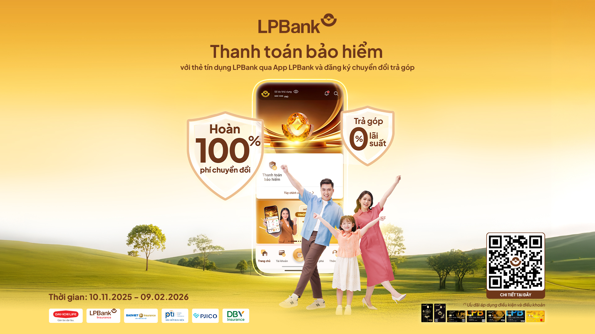 Áp dụng cho tất cả các giao dịch thanh toán phí bảo hiểm nhân thọ Dai-ichi Life và bảo hiểm phi nhân thọ (LPBI, PTI, DBV, PJICO, Bảo Việt) qua App LPBank bằng nguồn tiền từ thẻ tín dụng và chuyển đổi trả góp thành công.