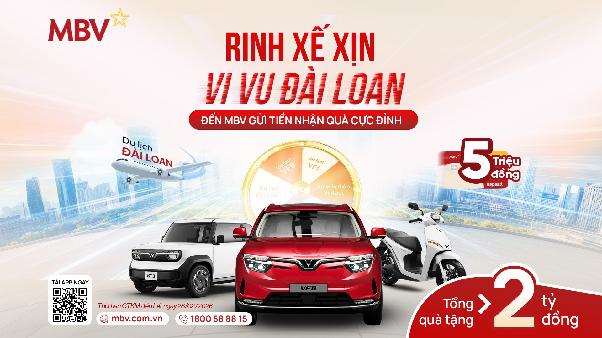 Theo đó, từ 17/11/2025 - 28/02/2026, Khách hàng cá nhân khi tham gia gửi tiền có kỳ hạn tại quầy hoặc gửi tiền trực tuyến qua ứng dụng MBV Bank sẽ có cơ hội nhận được các giải thưởng giá trị, bao gồm 01 xe ô tô VinFast VF8, 01 Xe ô tô Vinfast VF3, 12 xe máy điện VinFast Feliz Lite, 03 chuyến du lịch Đài Loan, cùng nhiều quà tặng 5.000.000 đồng vào tài khoản thanh toán.
