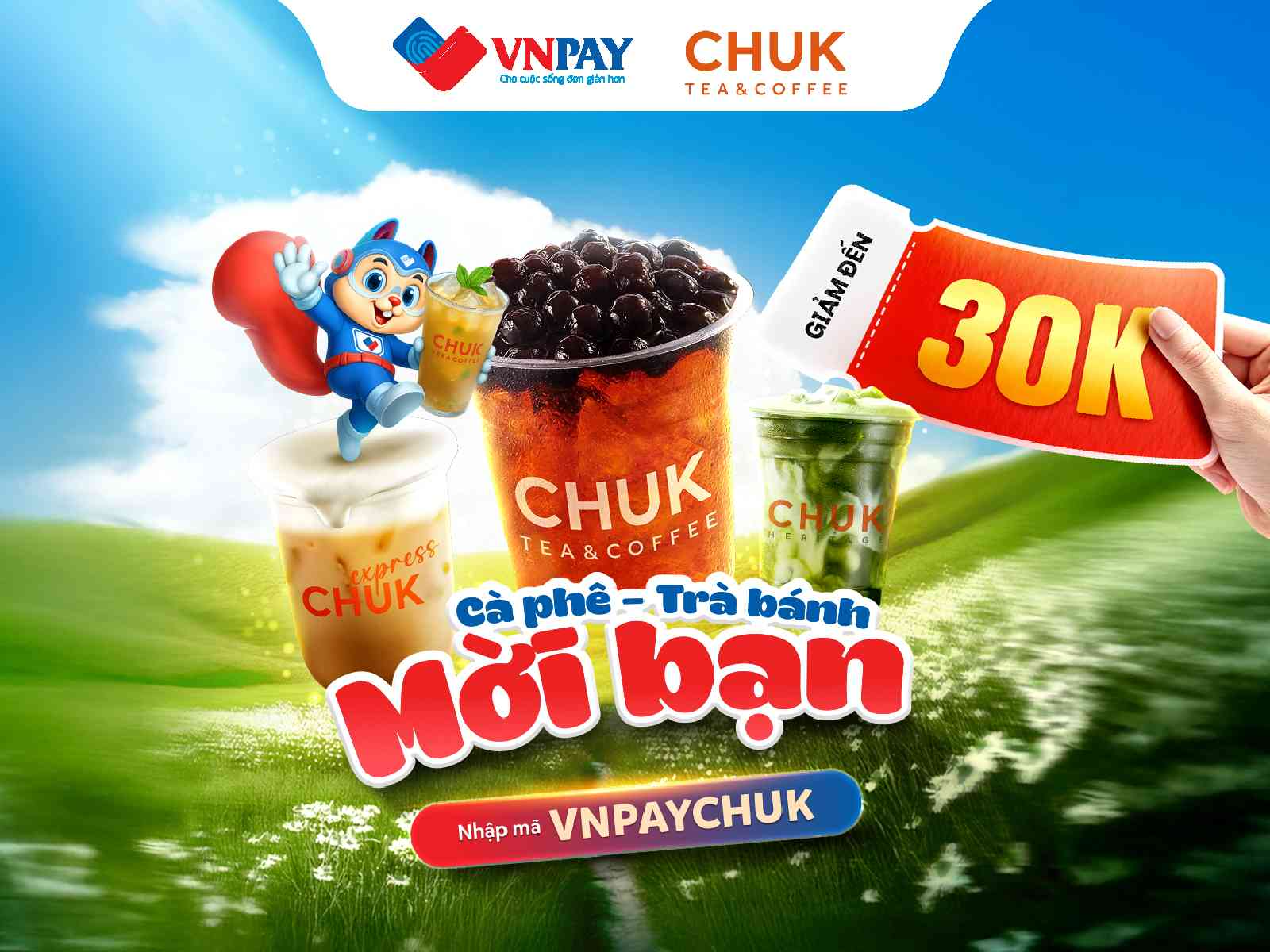 Theo đó, chỉ cần ghé cửa hàng Chuk Tea & Coffee thưởng thức món đồ uống yêu thích và nhập mã VNPAYCHUK khi thanh toán VNPAY-QR qua ứng dụng ngân hàng hoặc ứng dụng VNPAY, bạn sẽ nhận ngay ưu đãi giảm giá lên tới 30.000 đồng: