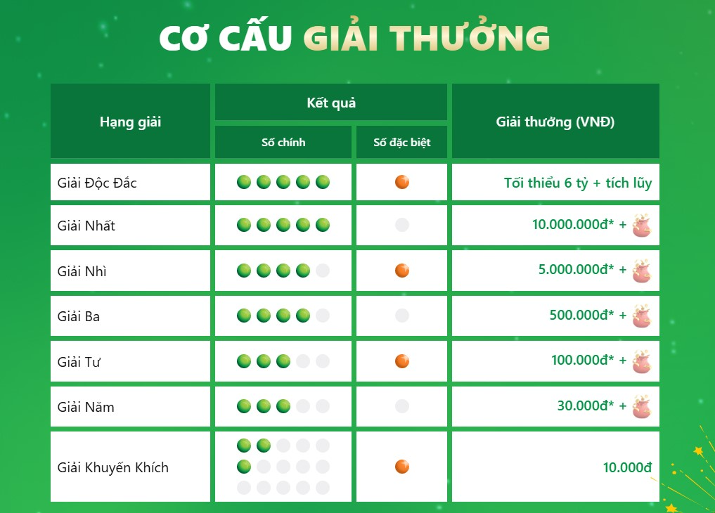 - Giải Độc Đắc trị giá tối thiểu 6 tỷ VNĐ + tiền tích luỹ: Bạn trúng 5 số chính và 1 số đặc biệt