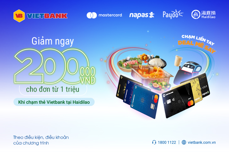 Thưởng thức lẩu Haidilao chuẩn vị, ấm cúng và tiết kiệm hơn cùng bộ thẻ tín dụng/thẻ thanh toán Vietbank Mastercard và Vietbank Visa.
